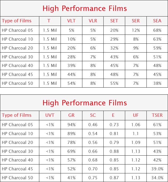 High Performance (HP) Charcoal is a professional quality metallized window film that provides maximum heat rejection and aesthetic appeal. These attractive films are color stable and covered by a lifetime warranty. They are available in 5, 10, 20, 30, 40 and 50 percent visible light transmissions, providing choices for compliance with any state or local laws.